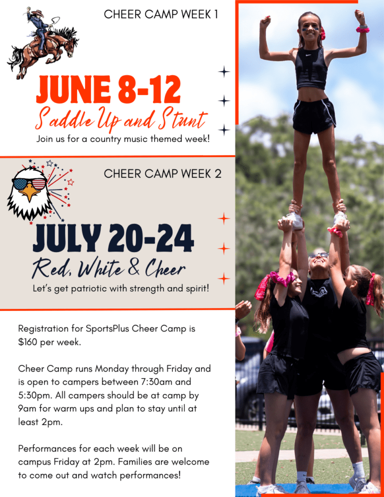 Join us for SportsPlus CHEER Summer Camp! We’ll include stunting, tumbling, conditioning, jumps, cheer dance routines, sideline cheers, and team bonding games! This summer promises to be a memorable experience filled with fun, friendship, and all things CHEER!